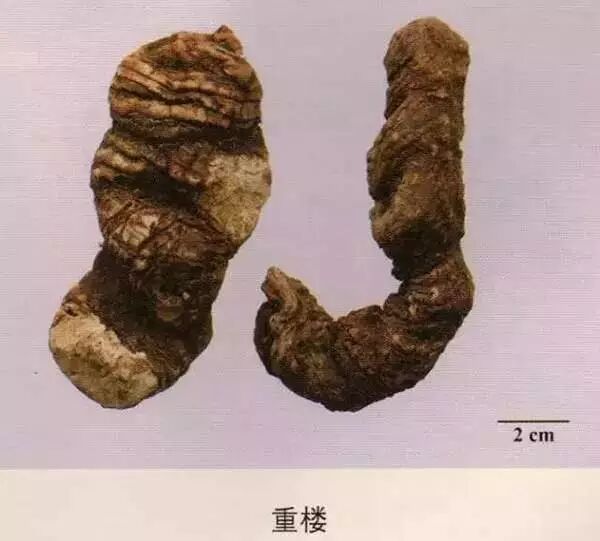 白及:药材,呈不规则扁球形,多有2~3个爪状分枝,长1.5~5cm,厚0.5~1.5cm。