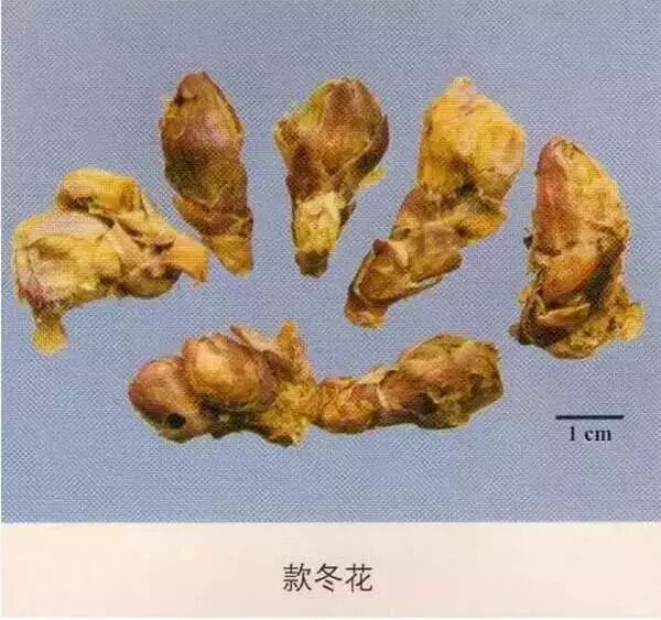 款冬花:呈长圆棒状。常单生或2~3个基部连生,长1~2.5cm,直径0.5~1cm。