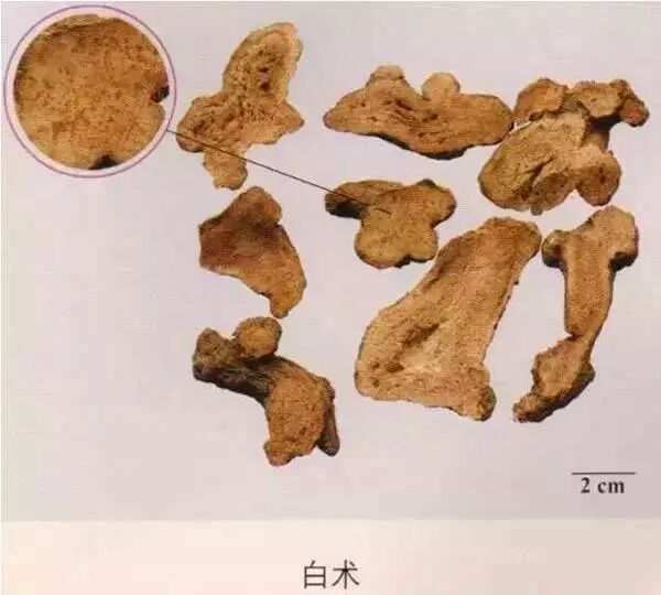白术:断面不平坦,黄白色至淡棕色,有棕黄色的点状油室散在