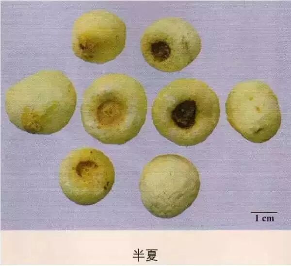 半夏:顶端有凹陷的茎痕,周围密布麻点状根痕