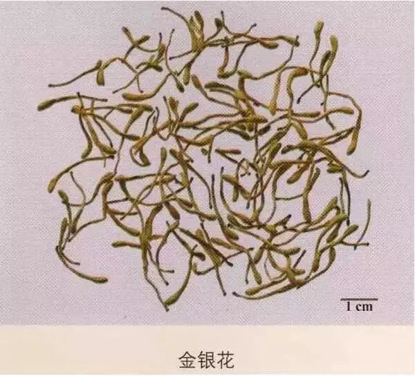 金银花:呈棒状,上粗下细,略弯曲