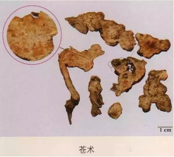 苍术:茅苍术,质坚实,断面黄白色或灰白色,散有多数橙黄色或棕红色油室,暴露稍久,可析出白色细针状结晶。