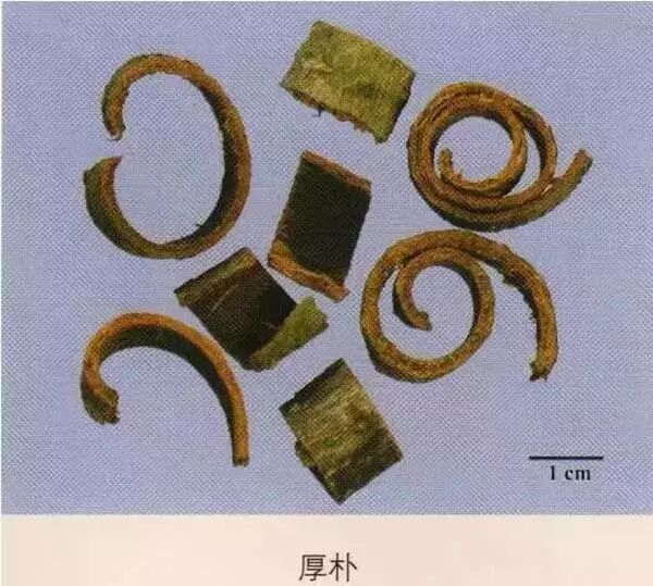 厚朴:干皮,具细密纵纹,划之显油痕。质坚硬,不易折断,断面颗粒性,外层灰棕色,内层紫褐色或棕色