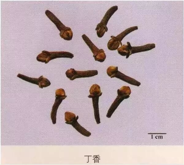 丁香:药材,略呈研棒状,长1~2cm。气芳香浓烈,味辛辣、有麻舌感。