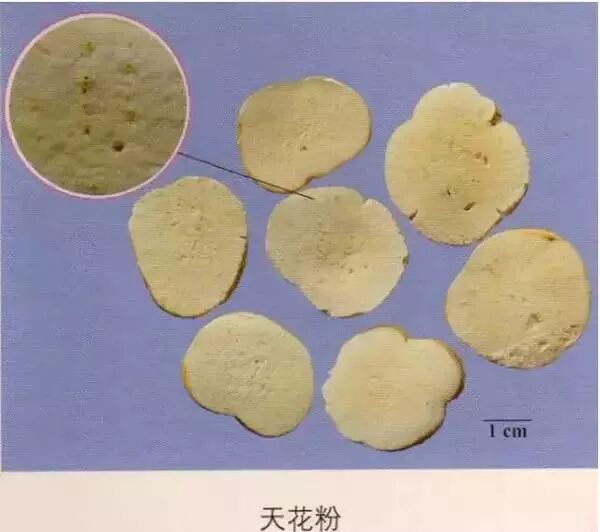 商陆:切面木部隆起,形成数个突起的同心性环轮,俗称罗盘纹。