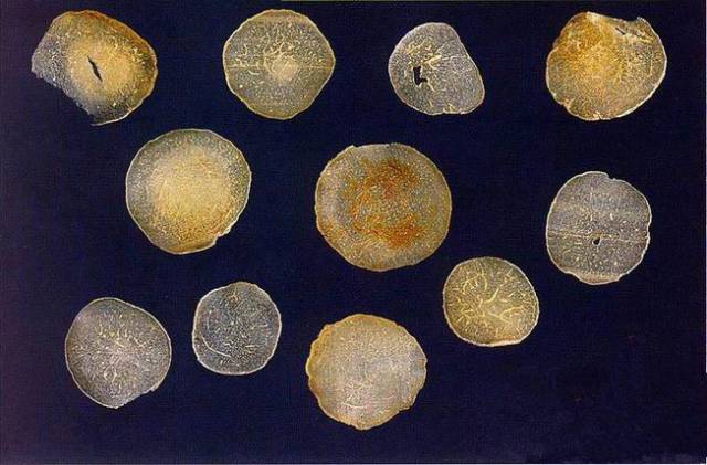 上端多圆平,中心有凹陷的黄棕色的茎痕,周围密布棕色凹点状须根痕,下面钝圆而光滑,质坚实,致密。