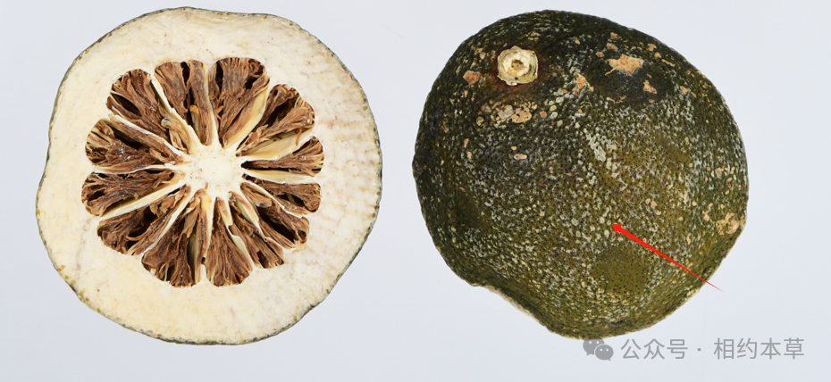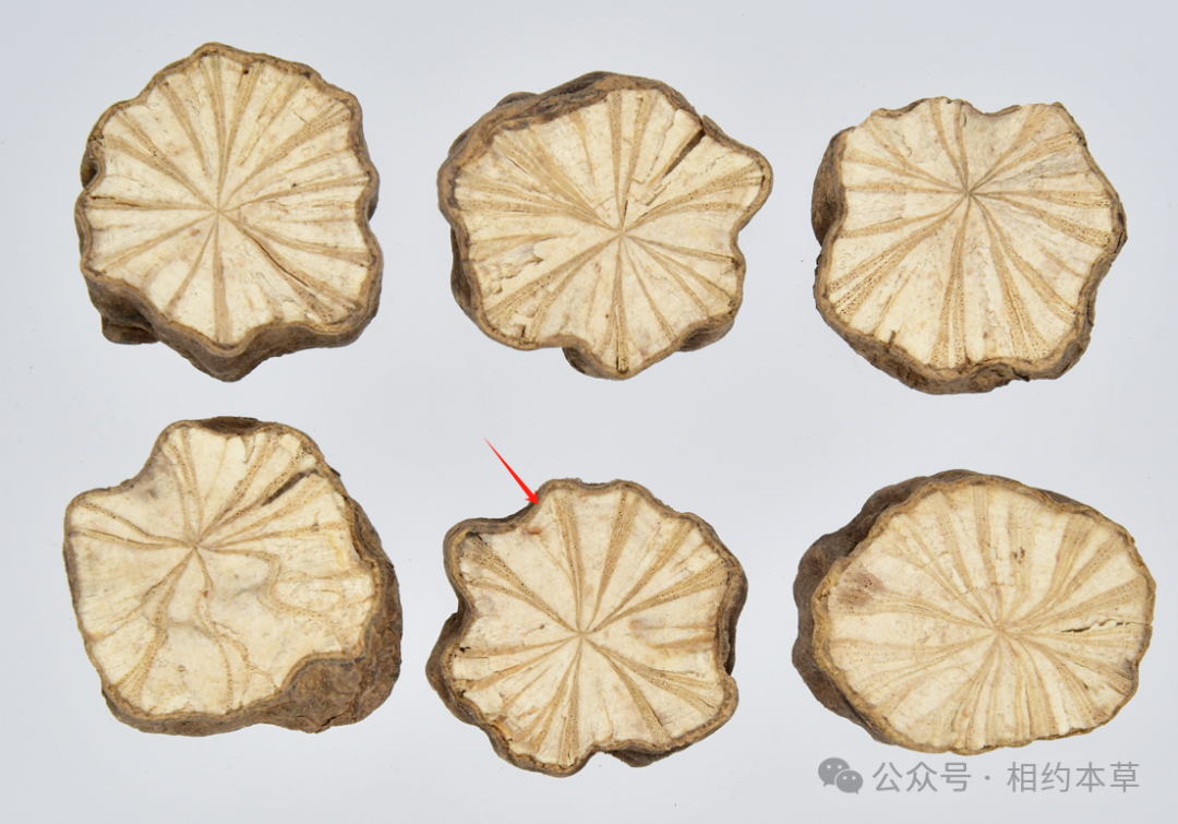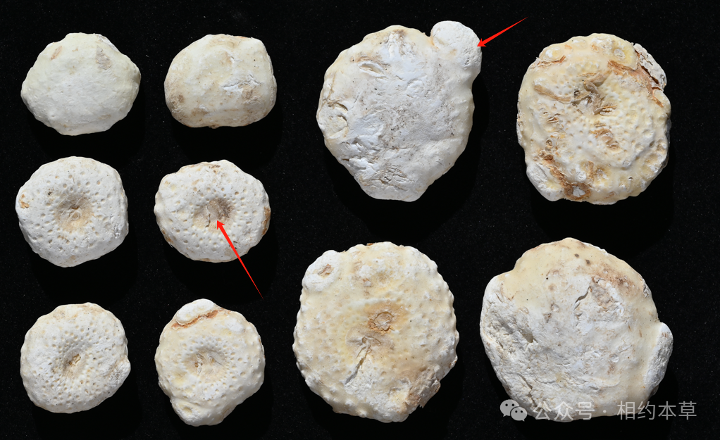 鉴别要点:茎痕在中心;扁饼状;个大茎痕周边有侧芽