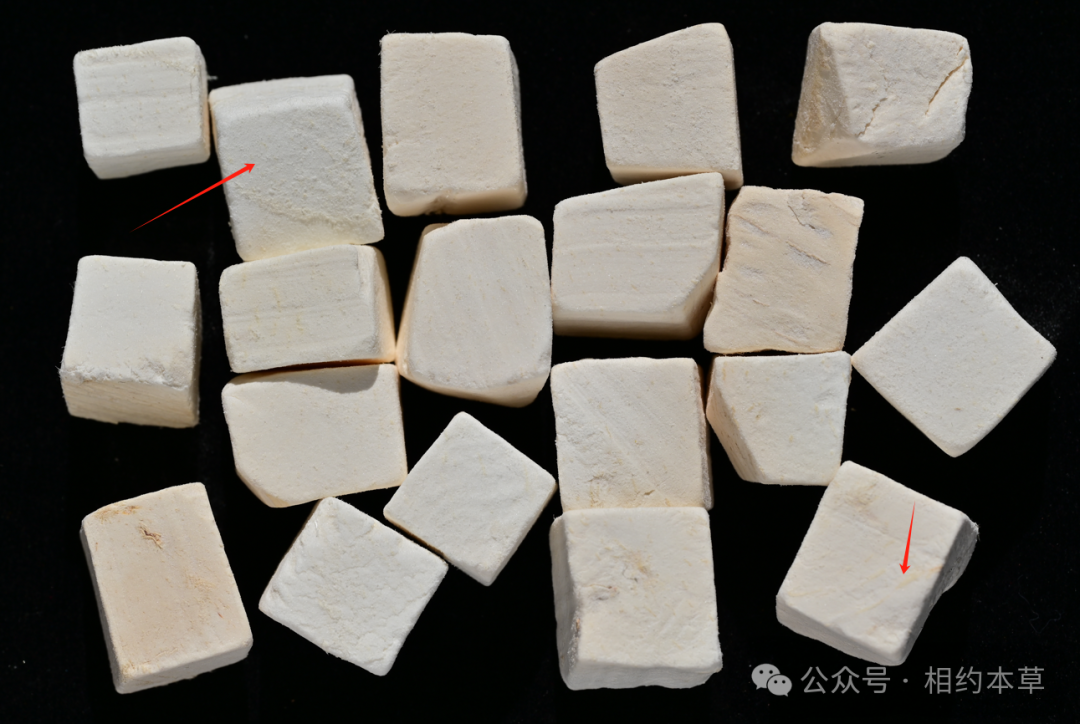 鉴别要点:粉性足,手摸留粉较多;可见筋脉点