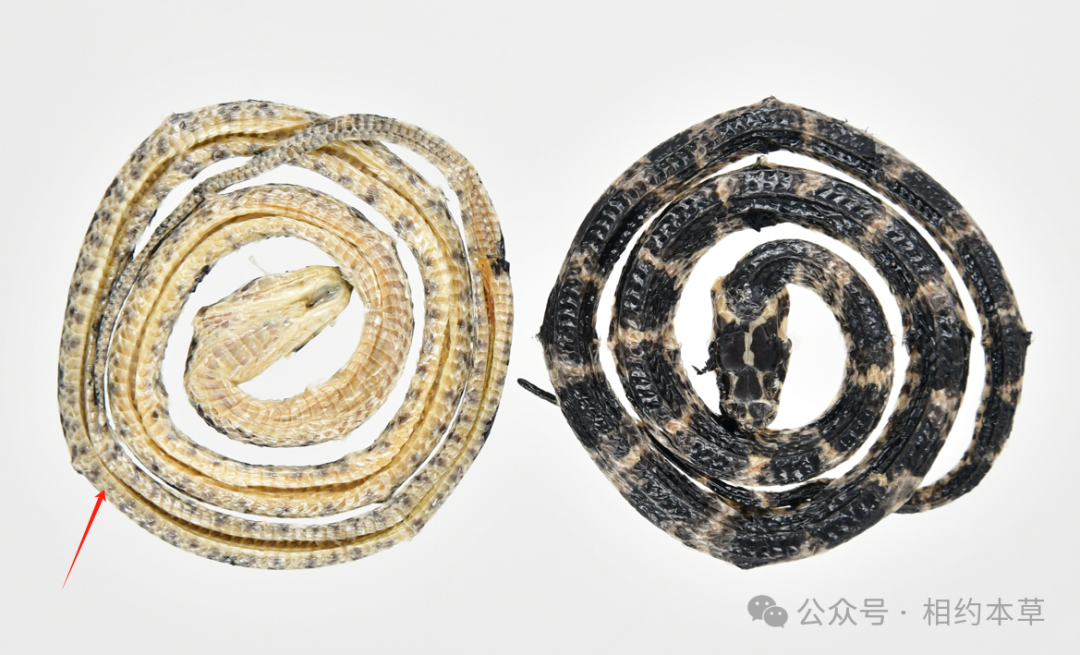 鉴别要点:背部鳞片不自然;腹面黑白相间鳞片宽度非2:1