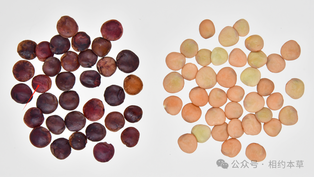 鉴别要点:口尝有豆腥味;加工过的兵豆表皮皱缩;圆饼状