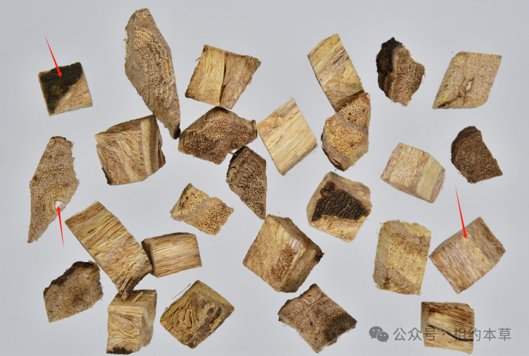 鉴别要点:可见双子叶茎的特征:白色的髓、墨绿色的茎皮;纵向切面纤维明显、无淀粉