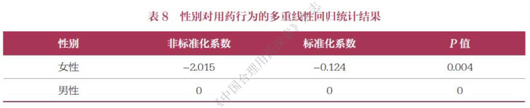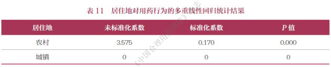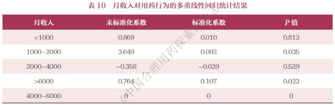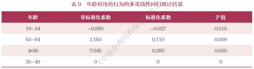 性别、年龄、月收入、居住地影响家长用药行为得(P<0.05),其余自变量对用药行为的影响无统计学差异(表3)。分别以家长性别、年龄、月收入、居住地为自变量,以受访者用药行为得分为因变量进行多重线性回归分析(表8~11)。在家长用药行为方面,女性得分低于男性,用药风险较男性家长低。50~64 岁、65 岁以上家长的用药行为得分高于 35~49 岁家长的用药行为得分,故 50 岁以上家长用药行为风险性相对较高(表9)。月收入4000~6000元的家长用药行为得分高于1000~2000元、>6000 元的家长,月收入4000~6000 元的家长用药行为风险性相对高。农村家长用药行为得分高于城镇家长,农村家长用药行为风险较高。