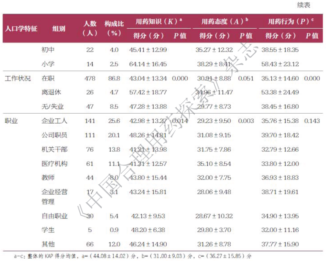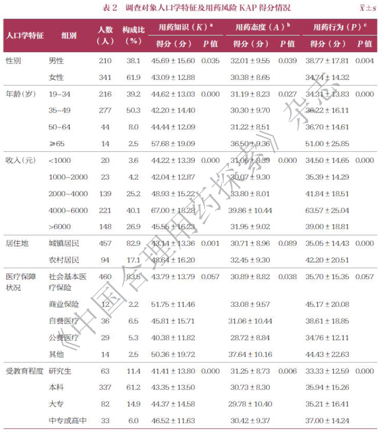 共收集得到有效问卷 551 份。调查对象中,男性 210 人(38.1%),女性 341 人(61.9%);年龄分布主要为中青年(65 岁以下),占97.5%;月收入水平 4000 元以上者占 67.0%;城镇居民占 82.9%;社会基本医疗保险占83.5%;受教育程度大专及以上学历者占 87.5%;工作状况为在职者占比最高(86.8%);职业分布中,企业人员(企业工人、公司职员和企业经营管理者)占比相对较高(48.8%)。不同性别、年龄、收入、受教育程度和职业的受访对象用药知识、用药行为、用药态度得分比较具有统计学差异(P<0.05)(表2)。