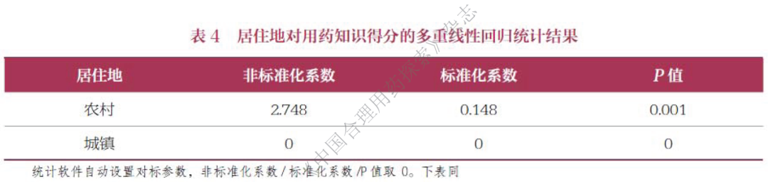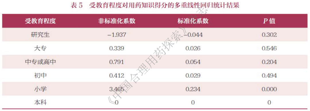 居住地和受教育程度影响家长用药知识得分(P<0.05),其余变量无统计学差异(表3)。分别以家长居住地、受教育程度为自变量,以受访者用药知识得分为因变量进行多重线性回归分析(表4 和表5)。在居住地中,农村家长用药知识得分高于城镇家长得分,故农村家长用药风险相对高。小学学历的家长用药知识得分高于本科学历的家长得分,用药风险相对较高。