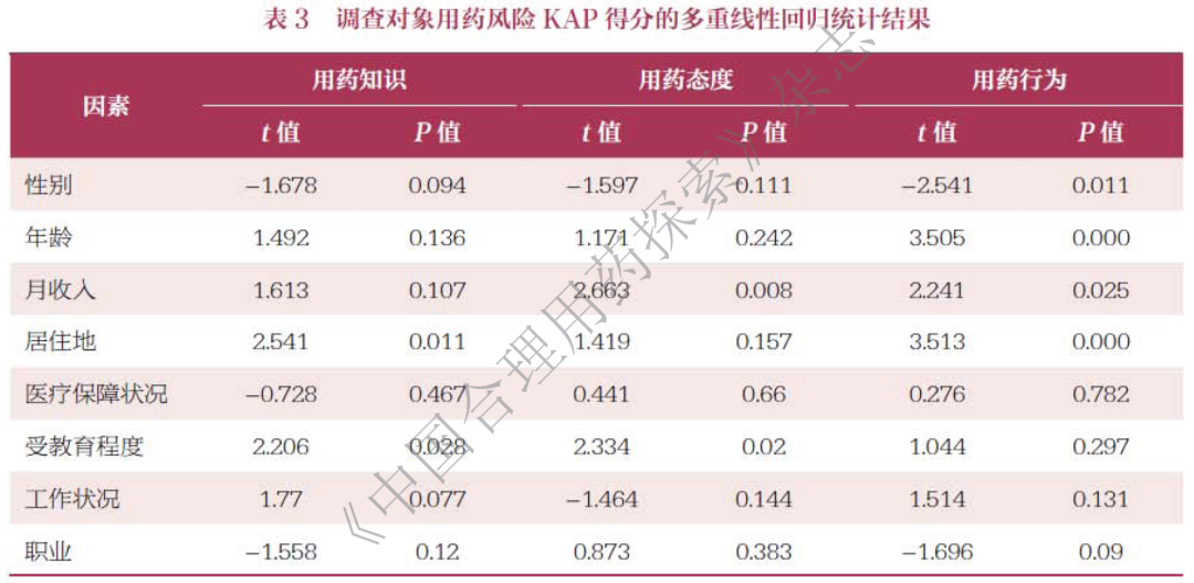 以家长基本信息中的 8 个因子(性别、年龄、月收入、居住地、医疗保障状况、受教育程度、工作状况、职业)为自变量,以受访者用药知识、用药态度和用药行为的得分为因变量,进行多重线性回归分析(表3)。