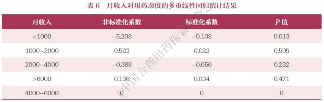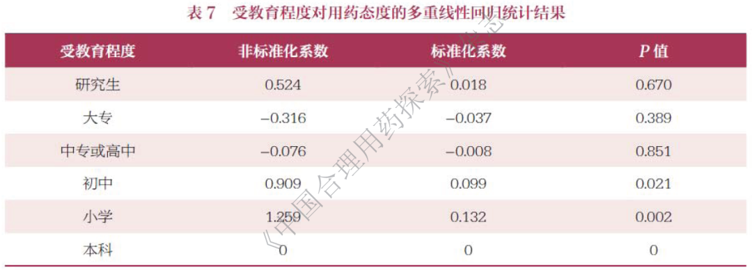 月收入和受教育程度影响家长用药态度得分(P<0.05),其余自变量对用药态度无统计学差异(表3)。分别以家长月收入、受教育程度为自变量,以受访者用药态度得分为因变量进行多重线性回归分析(表6 和表7)。月收入低于 1000 元的家长用药态度得分较低。小学、初中学历的家长用药态度得分较高,用药态度较其他学历的家长好。