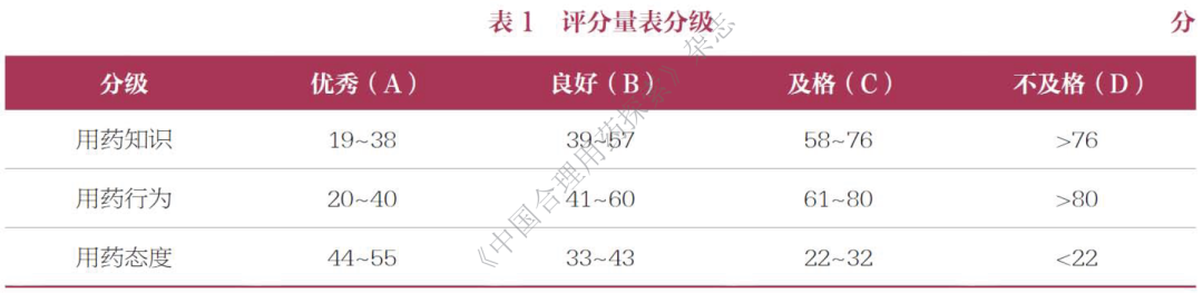 对中药用药知识、用药行为、用药态度中的每项问题,根据其赞同程度和发生频率用数字进行量化:① 1 分:极不赞同/从不/极无必要。② 2 分:不赞同/偶尔/没必要。③ 3 分:一般赞同/时常/一般有必要。④ 4 分:赞同/经常/非常有必要。⑤ 5 分:极为赞同/总是/极有必要。评分量表分级为 4 级(表1)。用药知识和用药行为的分值越高表示赞同程度越高,风险性越大;用药态度分值越低,风险性越大。