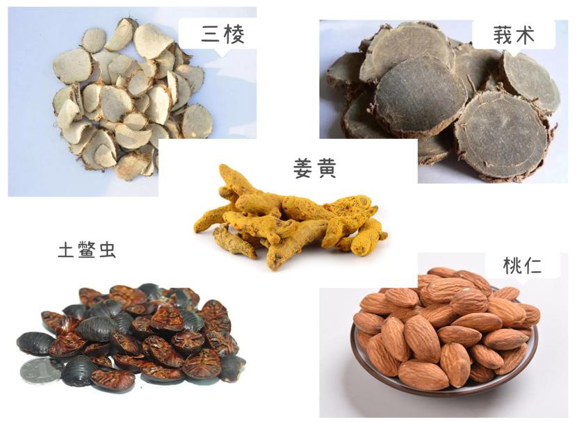 这类药物能加速血液流动,使血管扩张,如莪术、三棱、水蛭、虻虫、斑蝥、穿山甲、红花、桃仁、蒲黄、川芎、乳香、五灵脂、姜黄、三七等。含有上述药物的中成药包括云南白药酊(膏、气雾剂)、红药片(胶囊)、活血止痛散(片、胶囊、软胶囊)、颈痛颗粒、少腹逐瘀丸(胶囊、颗粒)、调经活血片、瘀血痹片(胶囊、颗粒)、柴胡舒肝丸等。