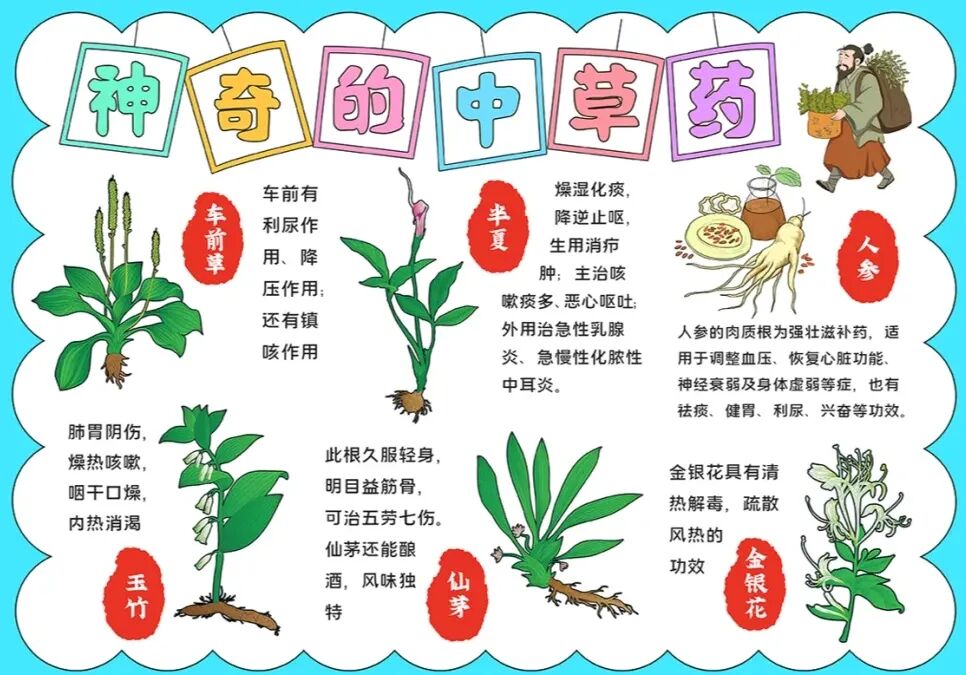 文字内容方面,可以编写中医药小故事、中医养生小贴士或中药材的简介等。文字应简洁明了、易于理解,并适当加入一些有趣的元素,如谜语、成语等,以吸引孩子们的注意力。