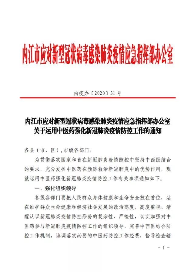 日前,内江市应对新型冠状病毒感染肺炎疫情应急指挥部办公室发布通知,要求运用中医药强化对新冠肺炎疫情防控工作。