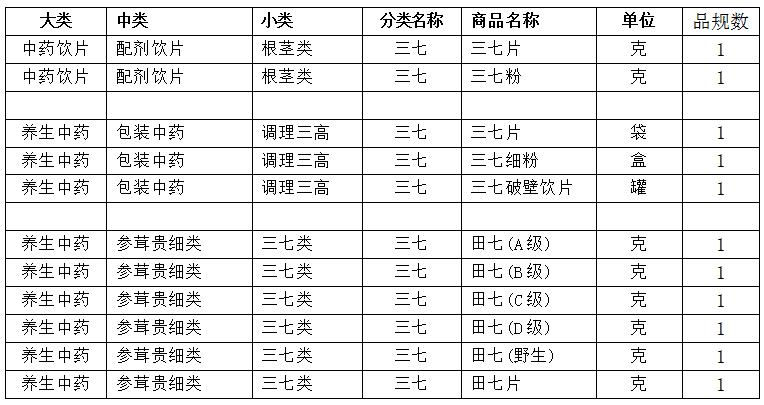 中药品类的中分类主要有三大类别,分别是配剂饮片、包装中药、参茸贵细:配剂饮片又称处方饮片,根据药材的入药部位分类,可以分为根茎类、果实类、花草类等;包装中药有补益养生类、花茶类、调理三高类等;参茸贵细则分虫草燕窝类、人参类、三七类、石斛、海产品类等。分类后再考虑价格带与剂型。