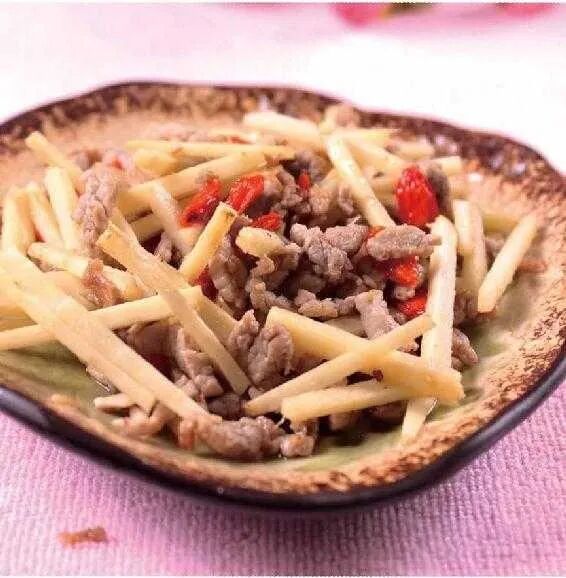 原料 枸杞子20克,猪瘦肉300克,竹笋100克,食用油、盐、白糖、香油、料酒、酱油各适量。