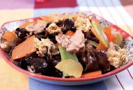 ②热锅下油,下姜片、葱段爆香,再下肉片炒变色,加入黑木耳、胡萝卜、莴笋片炒熟,放入盐、菊花即成。