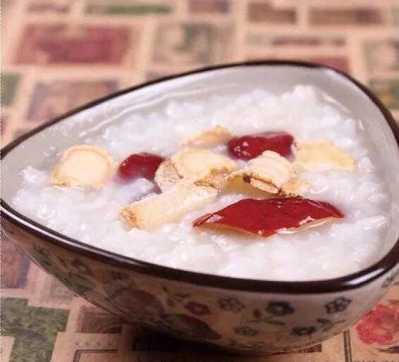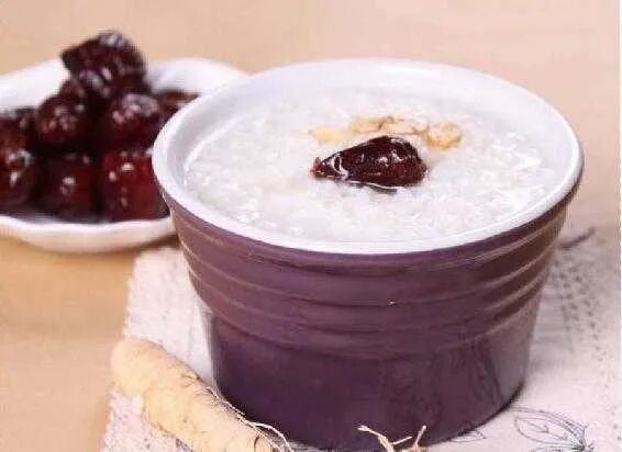 人参5克,粳米80克,蜜枣10枚,红糖适量。将人参放入锅中,加适量水,以中火煮开;加入粳米以大火煮沸,改用小火煮25分钟;再用大火煮沸,熄火加入蜜枣加盖闷5分钟,加入红糖即可。