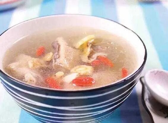老鸭半只,沙参、玉竹、枸杞子各15克,姜片、盐各适量。老鸭剁块,洗净,汆水待用;沙参、玉竹、枸杞子洗净;将所有材料放入炖盅,加入沸水,小火隔水炖1~2个小时,加盐调味即成。