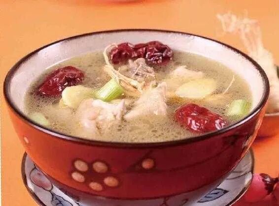 鸡1只,人参5克,红枣3枚,葱段、生姜、盐各适量。将鸡去头尾、内脏洗净,剁成块,入沸水锅中焯一下,冲洗干净。将鸡块放入砂锅,加入人参、红枣、生姜、葱段,用大火煮沸,撇去浮沫,改小火煮1个小时至烂熟,加盐调味即可。