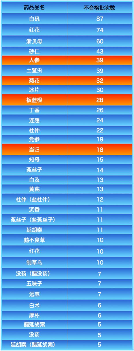2017年国家食品药品监督管理总局公布的793批次不合格中药饮片产品,一共涉及75个品类。(以下为不合格批次数≥5次品类清单↓↓↓)其中白矾的不合格批次最多,为87批次。其他进入榜单前5名的还有:红花74批次、浙贝母60批次、砂仁43批次、人参和土鳖虫均为39批次。另外还有人参、菊花、板蓝根、当归等常用药多批次存在问题。
