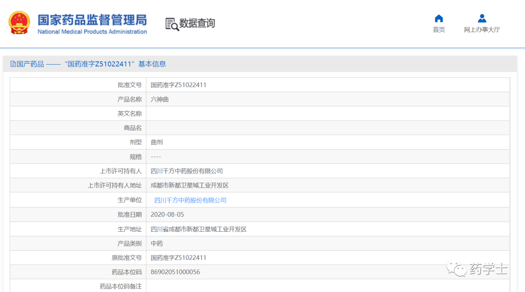 六神曲,批准文号之一为国药准字Z51022411,类型是曲剂。