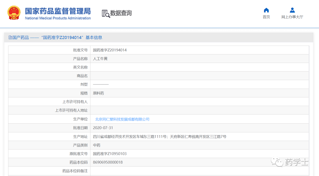 人工牛黄,批准文号之一为国药准字Z20194014,类型为原料药。