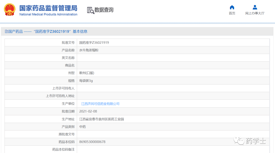 水牛角浓缩粉,批准文号之一为国药准字Z36021919,类型是散剂。