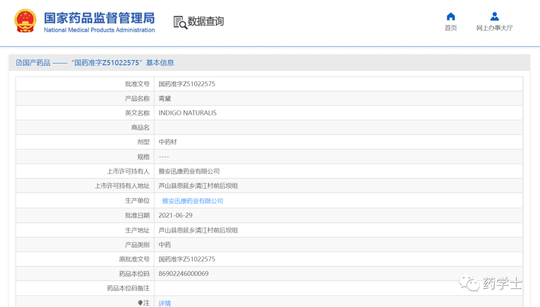 如青黛,批准文号之一为国药准字Z51022575,类型是中药材。