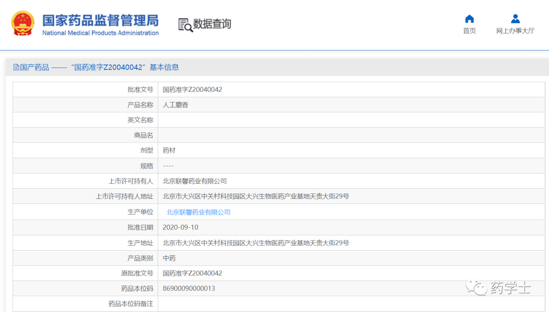 人工麝香,批准文号之一为国药准字Z20040042,类型是药材。
