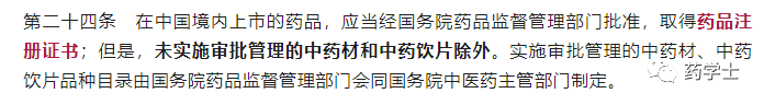 先说国药准字,1985年7月1日,第一版《中华人民共和国药品管理法》开始施行。《药品管理法》的核心内容之一,就是对药品实施批准文号管理。为此,国家药监局专门在2004年6月18日对药品注册司组织起草的《中药饮片注册管理办法》、《关于中药饮片实施批准文号管理有关事宜的通知》、《关于发布实施批准文号管理的中药饮片品种目录(第一批)的公告》进行了意见征求。但是,至今相关文件仍然没有正式出台。在最新的《药品管理法》第二十四条是这样描述的: