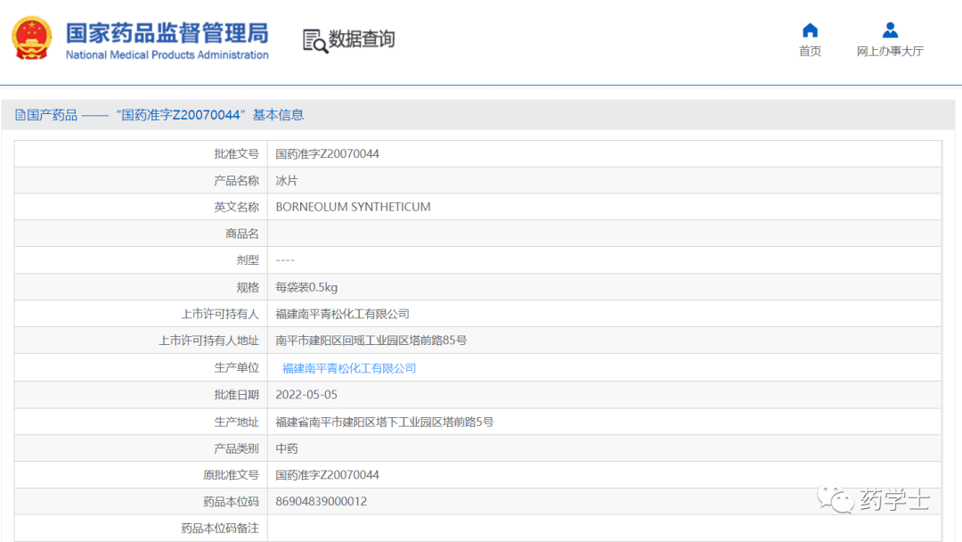 冰片,批准文号之一为国药准字Z20070044,类型无。