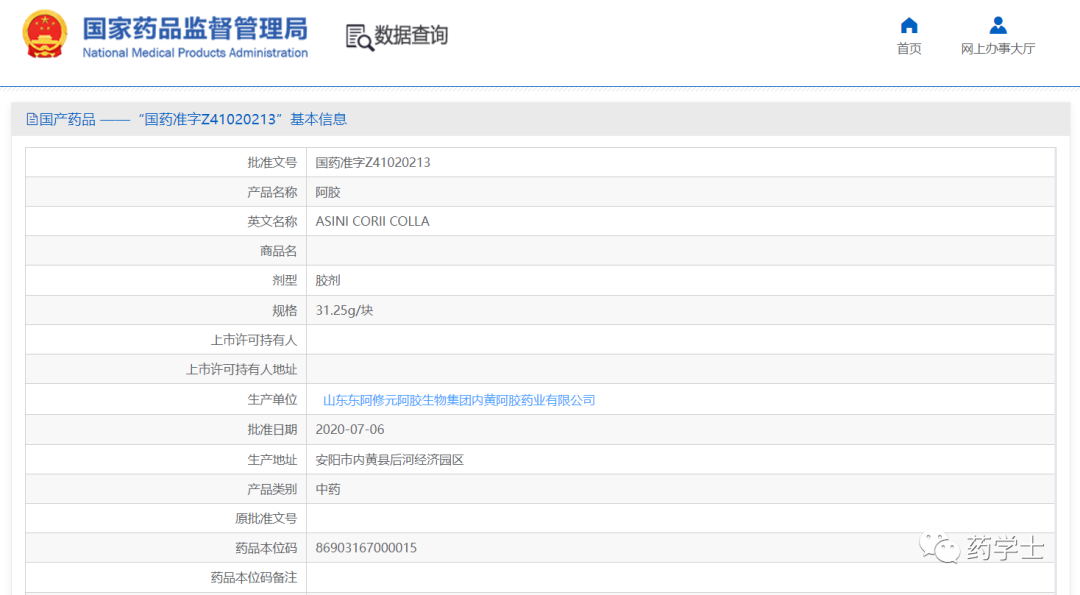 阿胶,批准文号之一为国药准字Z41020213,类型是胶剂。