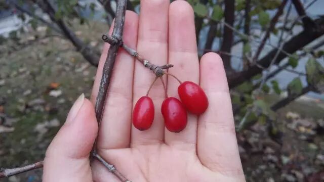 羡慕农业院校的同学秋天有果实吃。也羡慕我们药科大学的同学,嗯,我们有药吃。十一月份枝头红灿灿如樱桃一般的山茱萸成了我一个星期以来的零食。每天都会吃上四五颗,酸酸的,涩涩的,苦苦的。嗯,挺好吃的。本种(包括川鄂山茱萸)的果实称萸肉,俗名枣皮,供药用,为收敛性强壮药,有补肝肾止汗的功效。哦,对了,我之前长智齿牙疼,就是胡乱吃几颗山茱萸治好的。