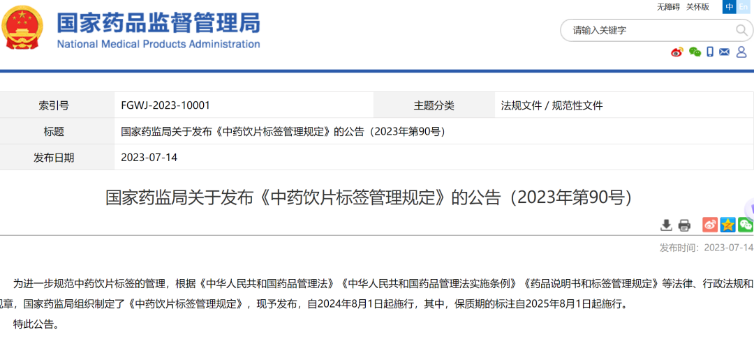 7月14日,国家药监局官网刊发公告,发布《中药饮片标签管理规定》。