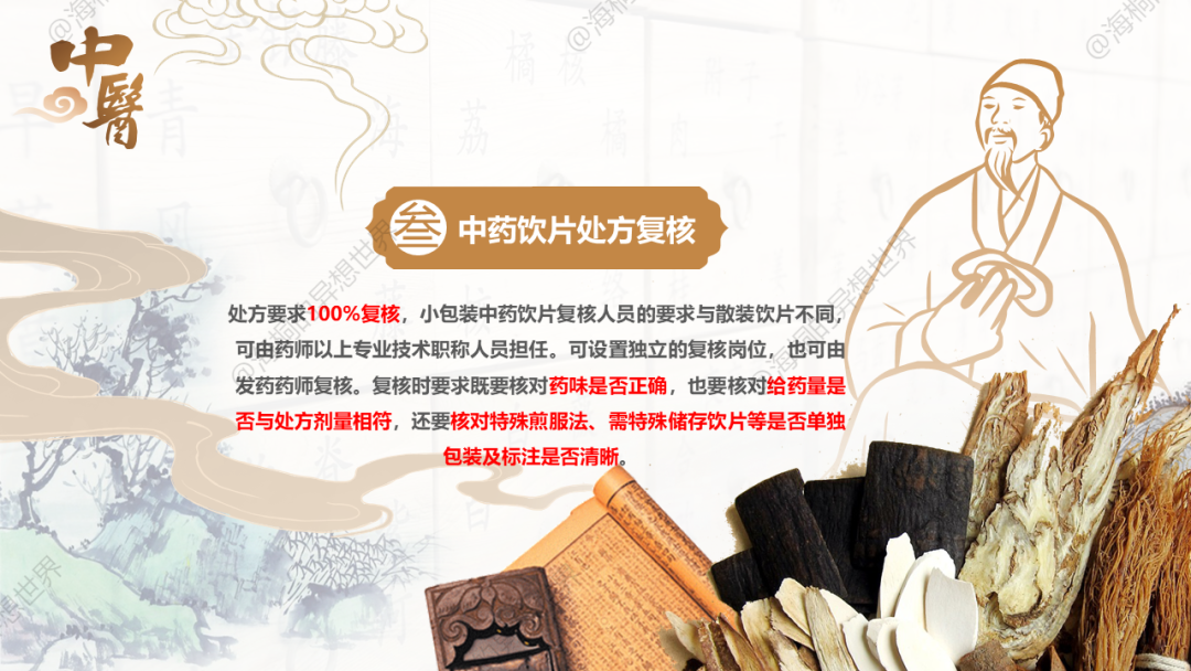 中药饮片处方调剂中审方、调配、复核、发药四个步骤中其实都需要涉及到审方这个环节,个人认为审方的含金量也是最高,难度最大。在审方中合法性、规范性、适宜性中,尤其以适宜性最为重要,在门诊中如何快速判断处方是否适宜,涉及到多学科知识,尤其是中医学、中药学、方剂学,如何通过有限的病历、中医诊断、甚至西医诊断来进行审方,跨过与医生的信息不对称,这是一个需要长期修炼的过程。