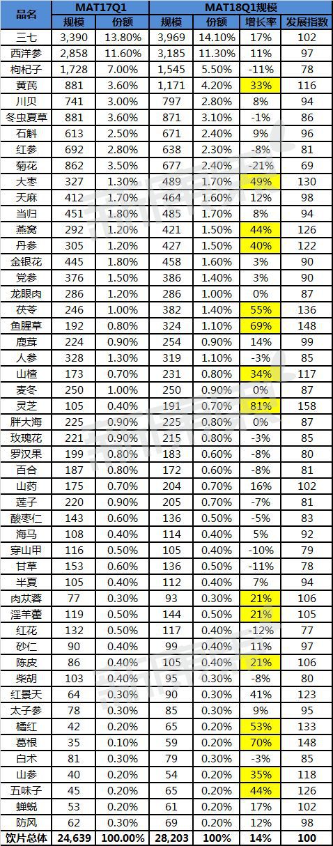 据中康CMH监测的最新数据显示,2018年第一季度,中药饮片销售前五的品种为三七、西洋参、枸杞子、黄芪、川贝,其中三七、西洋参、黄芪三个品种的销售额快速增长,均高达两位数。