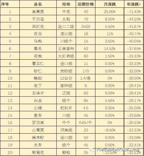再分析下跌幅排名前20的品种,可以看到:一是家种生产过热的品种,占跌价品种70%以上,如吴茱萸、百合、花椒、薏苡仁、西红花、白及、辣木籽等;二是需求萎缩的品种,如辣木籽、铁皮石斛、地丁等;三是旧库存量过大品种,如山茱萸、野菊花、牡丹皮、白芍等。