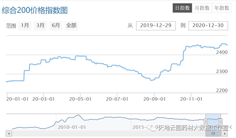 正是由于国内中药材产能与进口形势的变化,中药材天地网综合200指数在2020年表现为小幅震荡上行。具体表现为:一是春节前行情平稳,进入2020年第一季度,受疫情影响,综合200指数同比上涨9.11%,为近10年同阶段最高值。二是进入2020年7月,随着大批家种药材产新,指数快速下滑,同比下降1.32%,9月又开始回升2.30%;年度报收2451.86点,同比上涨8.36%,涨幅明显。