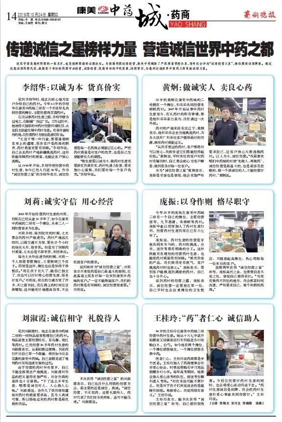 说到被评为诚信经营之星,刘莉表示不卖假药是自己最基本的原则,在此基础上服务好每一位来到康美中药城的客户。一定不能欺骗客户,我们的药材都是有保障的,诚信经营很重要。 刘莉说。