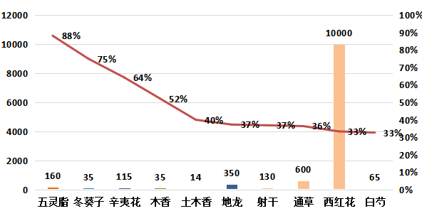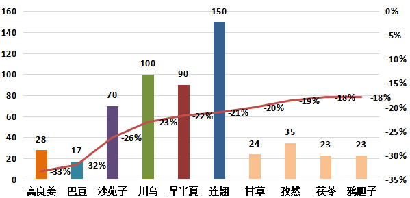 根及根茎类品规中,价格上涨的品规占13%;降价品规占14%;价格持平的品规占73%。