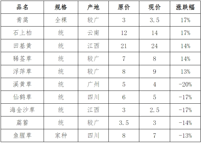 鱼腥草:市场滞留货源依然较丰,目前多维持小批量走动,行情低迷下行,家种货售价6-7元;野生货10元上下。
