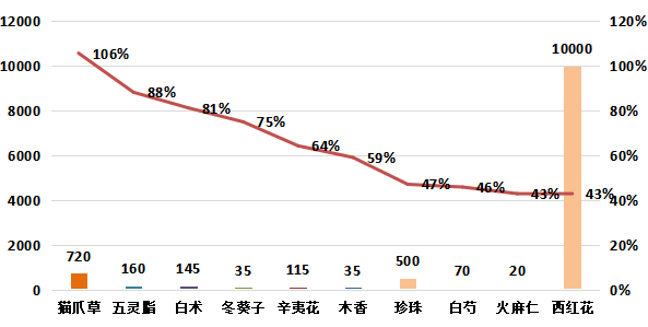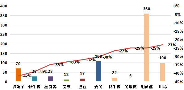 全草类品规中,价格上涨的品规占14%;降价品规占19%;价格持平的品规占67%。
