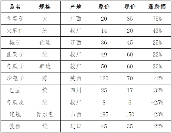 果实种子类品规中,价格上涨的品规占16%;降价品规占35%;价格持平的品规占49%。